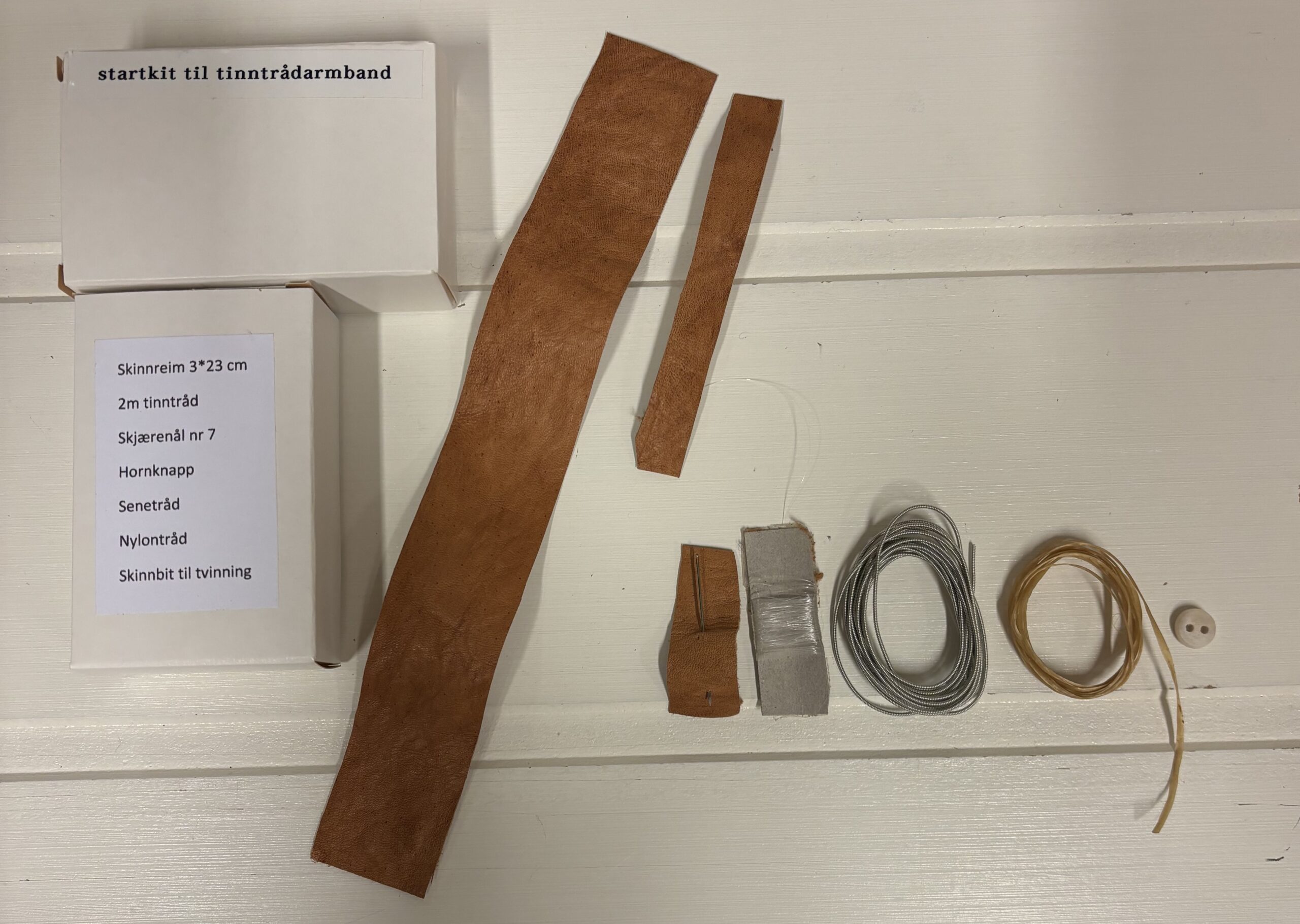Sy ditt eget skinnarmbånd med tinntråd i naturgarvet reinskinn. I pakken medfølger skinn, tinntråd, hornknapp, skjærenål nr 7, nylontråd og senetråd. Pris per pk. 199