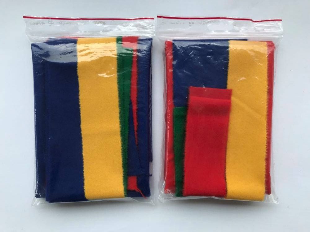 Pakke med klede til sliehppa, voksen / barn (opp til 8/10 år). Engelsk klede av høyeste kvalitet. 100% ull. Pakken består av brystklede (kvinne: 35 * 60 cm. mann: 35 * 65. jente/gutt: 28 * 45 cm.) i hovedfarge rød eller blå, samt remser i fargene blå, grønn, gul og rød.  Pris per pakke.